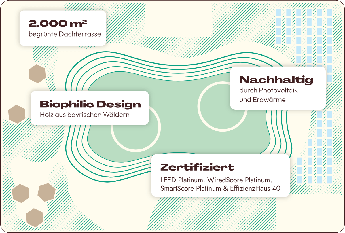 Zertifiziert nach EffizienzHaus 40, LEED Platinum, SmartScore Platinum und WiredScore Platinum, verbindet das M-Plaza modernste Technologien und Materialien mit biophilem Design. Grüne Innenhöfe, Dachterrassen und Büroflächen fördern das Wohlbefinden und die Produktivität. Gebaut aus regionalem Holz, recyceltem Stahl und überwiegend betrieben durch Geothermie und Solarenergie, reduziert das M-Plaza München den Energieverbrauch während Bau und Betrieb um bis zu 80 %. Dadurch wird es als eine der ersten Gebäude der Landeshauptstadt nahezu energieautark und klimaneutral!