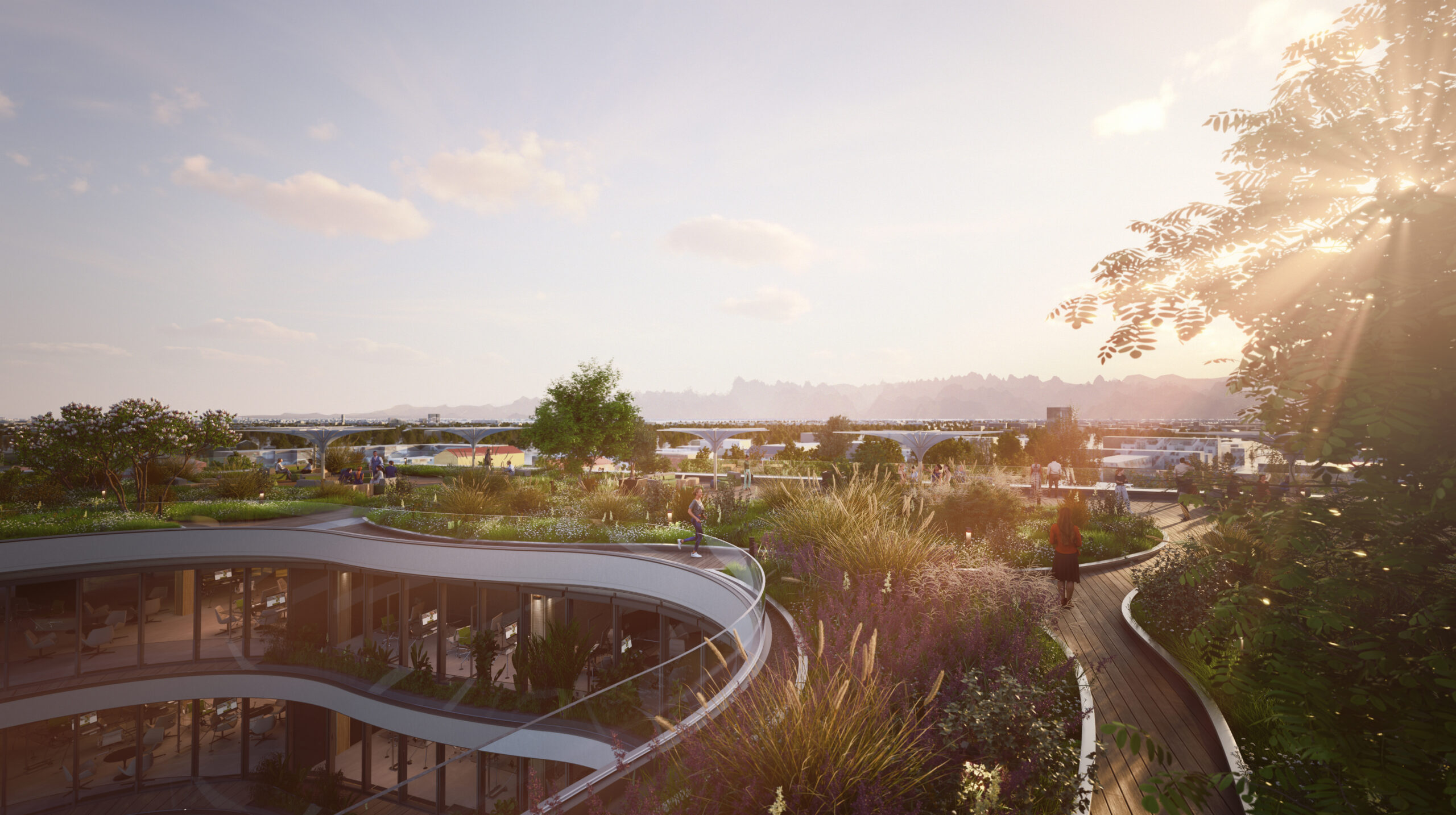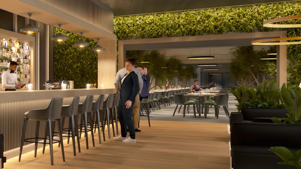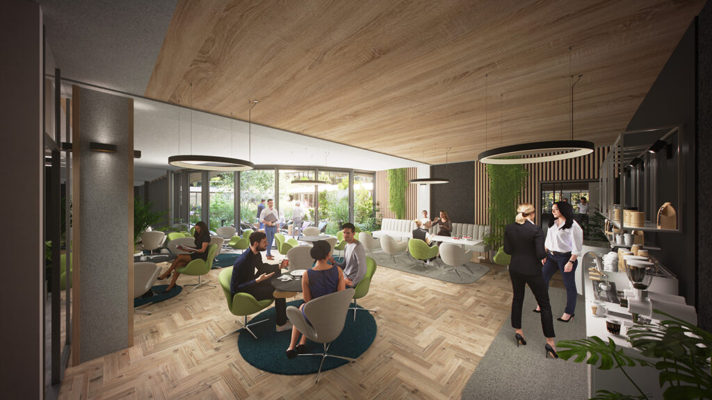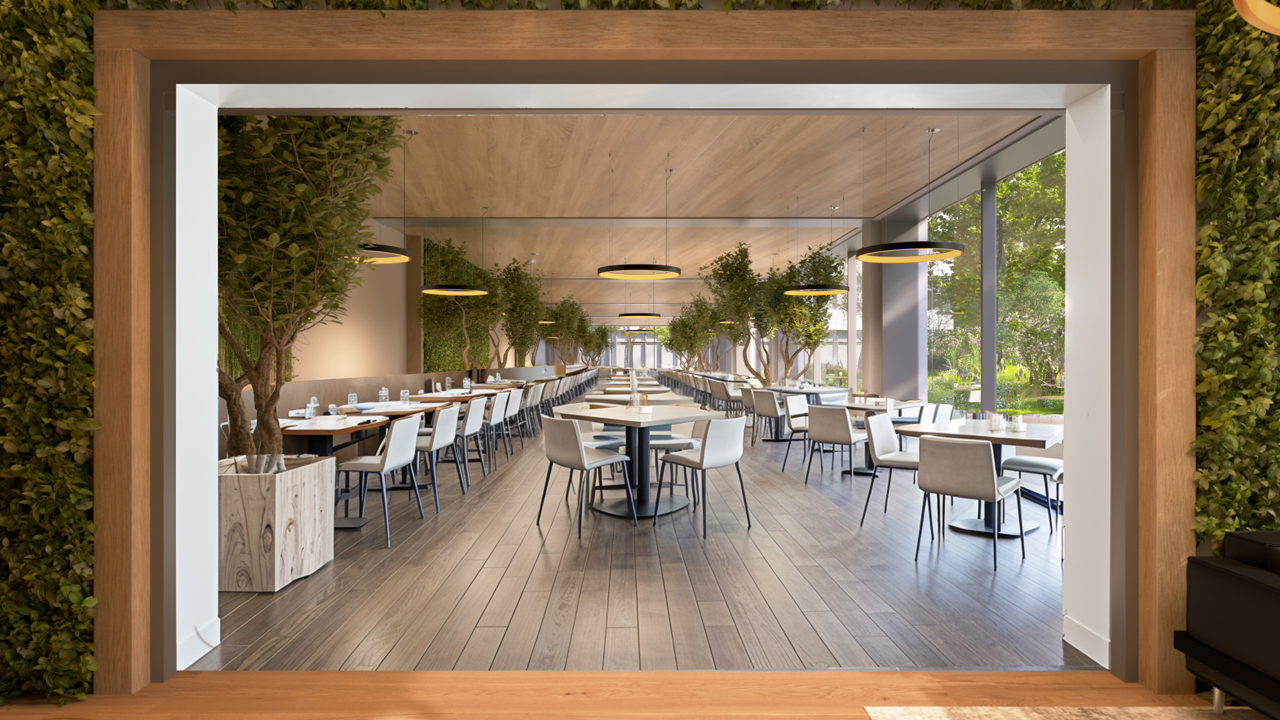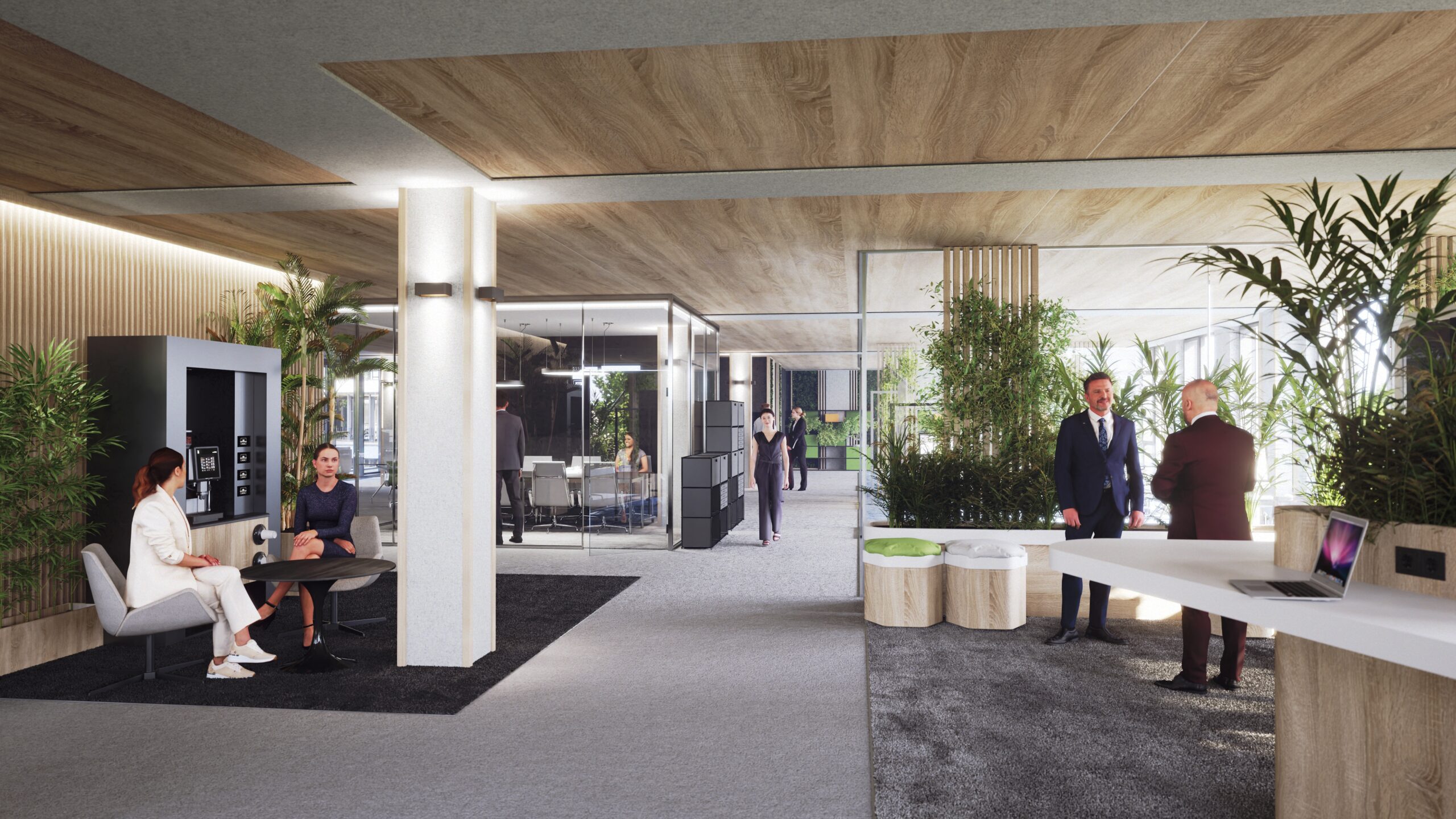 Biophilic Design Echtes Holz, großzügige Bepflanzung innen und außen sowie installationsfreie Decken |